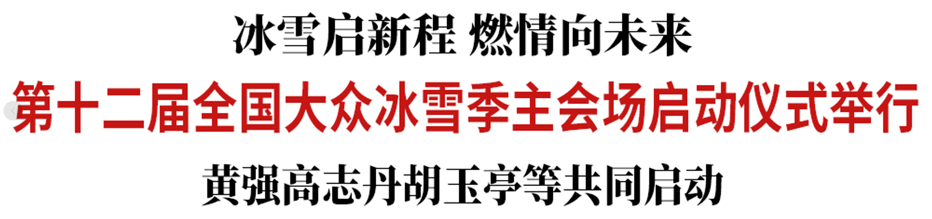 19时许,启动仪式正式开始,全场奏唱国歌。省政府党组成员金育辉致欢迎辞,诚邀各地朋友到吉林滑粉雪、赏雾凇、观冬捕,携手共创大众冰雪运动更加美好的明天。国家体育总局副局长佟立新致辞,预祝第十二届全国大众冰雪季圆满成功。国际奥委会主席考文垂视频致辞,祝愿大家度过一个精彩纷呈的雪季,尽享运动之乐、友谊之暖、冰雪之欢。优秀运动员代表周洋、武大靖共同宣读《冰雪运动倡议书》,文化和旅游部产业发展司司长缪沐阳发布“跟着赛事去旅行”2025—2026中国冰雪赛事活动目录。