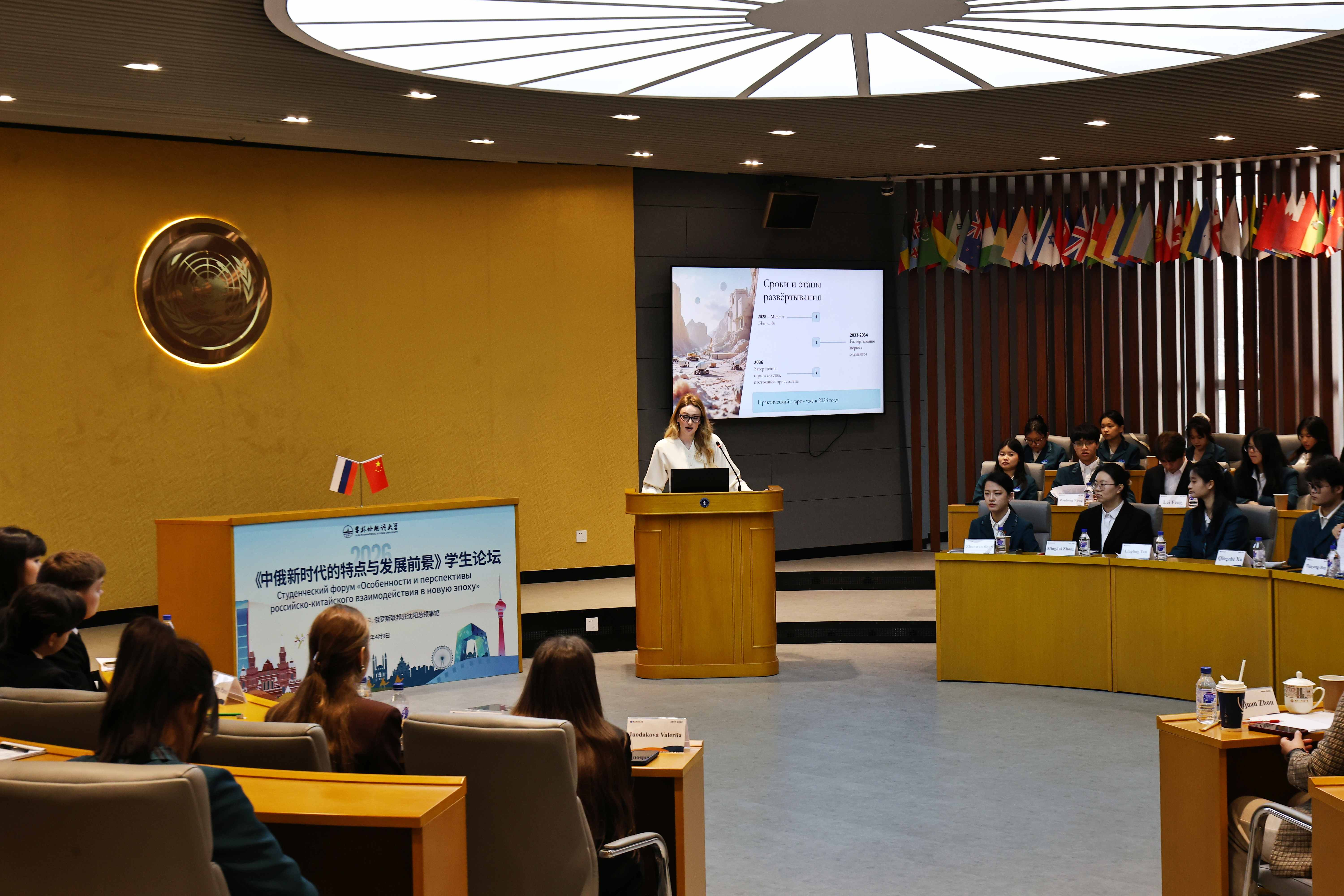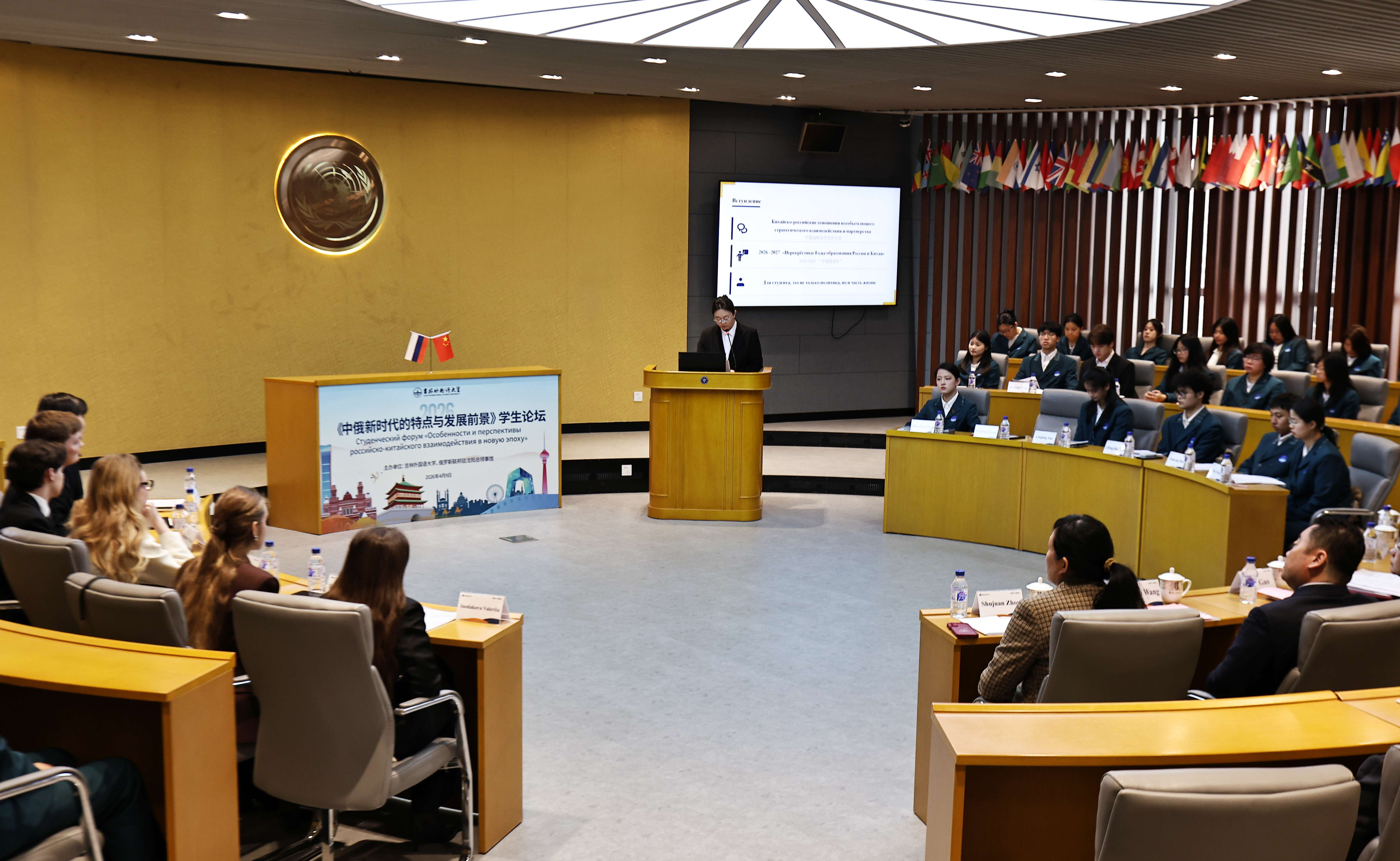 2026年是中俄教育年,为深化两国教育领域务实合作,拓宽人文交流渠道,厚植世代友好根基,助力中俄青年相知相交、互学互鉴,4月9日,由吉林外国语大学与俄罗斯联邦驻沈阳总领事馆联合举办的“中俄新时代的特点与发展前景”学生论坛在吉林外国语大学地球村举行。