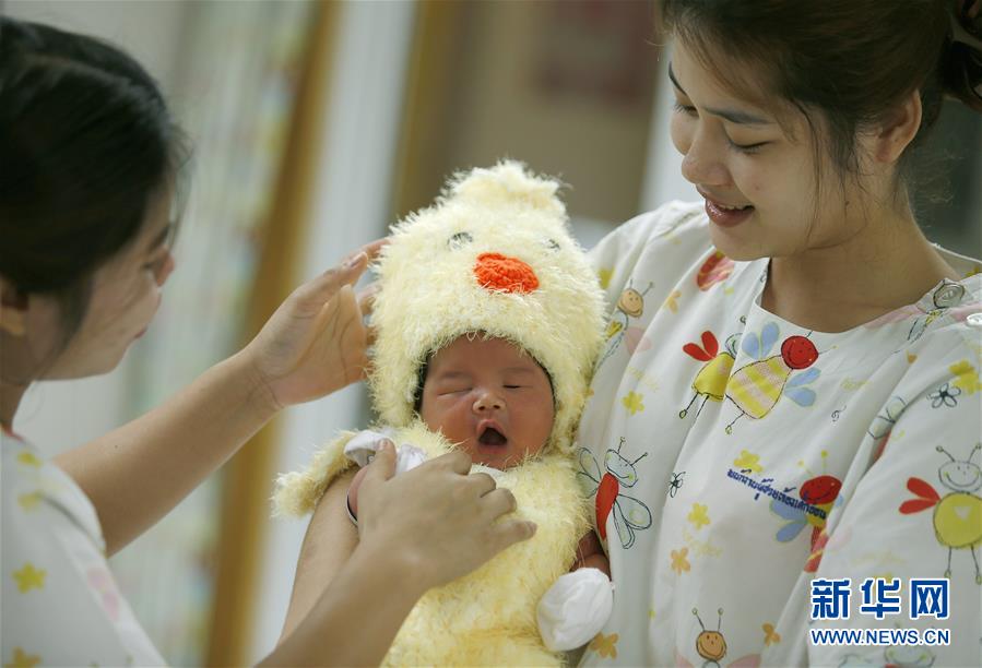 1月3日,在泰国曼谷,身着小鸡服装的婴儿躺在小床上。 2017年是鸡年,医院为新生儿穿上小鸡服饰,庆祝鸡年的到来。