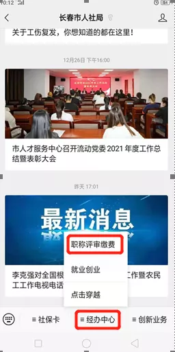 1.关注长春人社局公众号,点击经办中心-职称评审缴费